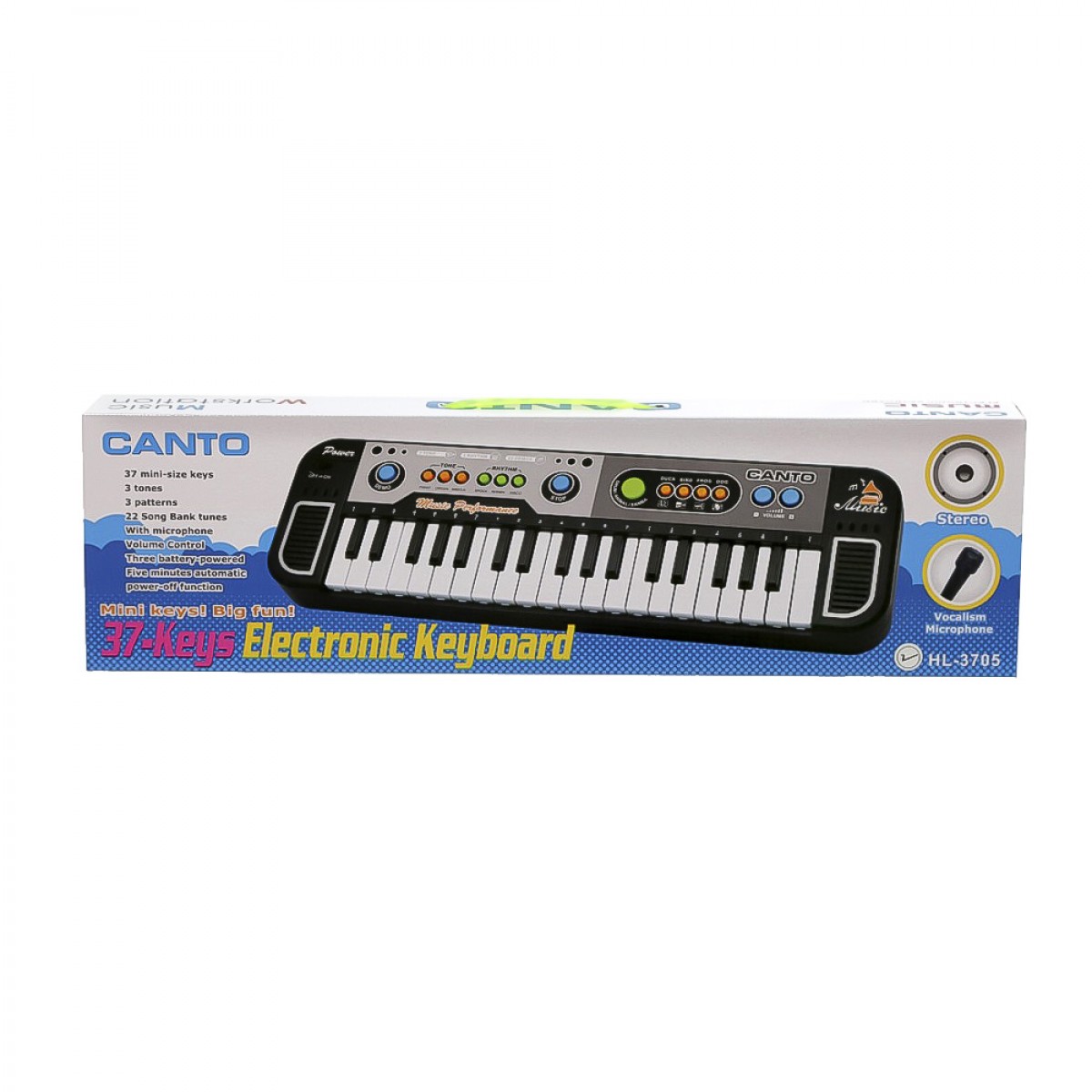 Αρμόνιο με μικρόφωνο με 37 πλήκτρα, 3 ρυθμούς, 3 τέμπο, 22 τραγούδια, και μικρόφωνο. Λειτουργεί με μπαταρίες (δεν περιλαμβάνονται). Αυτό το μουσικό όργανο θα κρατήσει τα παιδιά σας καθηλωμένα και ταυτόχρονα θα βοηθήσει στην ανάπτυξη των μουσικών τους δεξιοτήτων και του συντονισμού ματιού-χεριού.