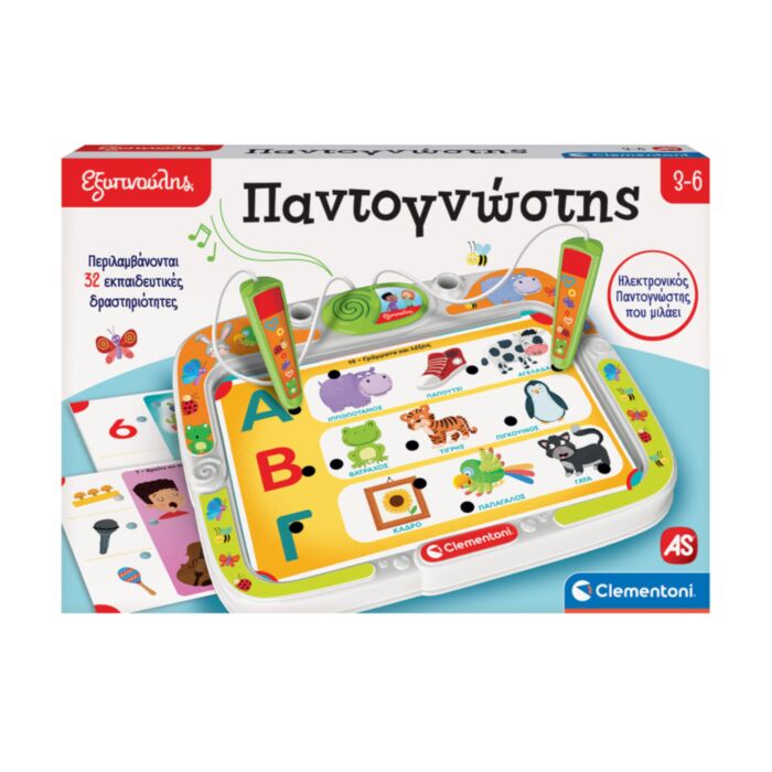 Ηλεκτρονικός Παντογνώστης που μιλάει με 2 διαδραστικές πένες! Περιλαμβάνει 32 εκπαιδευτικές δραστηριότητες και πάνω από 200 κουίζ γύρω από ποικίλα θέματα! Μέσα από το παιχνίδι, το παιδί θα συναντήσει χαριτωμένους χαρακτήρες, αγαπημένα ζώα και οικεία αντικείμενα και θα αρχίσει να αναγνωρίζει χρώματα, σχήματα, γράμματα και πολλά περισσότερα! Οι πένες βγάζουν ευχάριστα μηνύματα και ηχητικά εφέ όταν το παιδί διαλέγει τη σωστή απάντηση και το ενθαρρύνουν να προσπαθήσει ξανά σε περίπτωση λάθους.