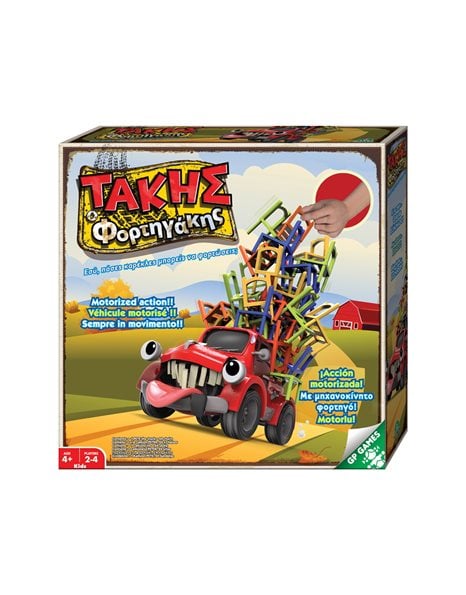 Φόρτωσε πρώτος όλες τις καρέκλες πάνω στον Τάκη Φορτηγάκη και κέρδισε!Το παιχνιδιάρικο φορτηγάκι, ο Τάκης, ξεκινά να κάνει γύρους μπροστά στους παίκτες. Η καρότσα του είναι άδεια και οι παίκτες ξεκινούν με τη σειρά να τοποθετούν τις καρέκλες τους όσο ο Τάκης κινείται όπως θέλει! Στόχος των παικτών είναι να φορτώσουν όλες τις καρέκλες τους στην καρότσα του, χωρίς όμως να τους πέσουν. Χρειάζεται προσοχή και ισορροπία, γιατί αν κάποιος παίκτης ρίξει τις καρέκλες, θα πρέπει να τις μαζέψει όλες! Ο πρώτος που θα φορτώσει όλες τις καρέκλες πάνω στον Τάκη τον Φορτηγάκη, είναι ο νικητής!Περιέχονται: 1 μηχανοκίνητο φορτηγάκι, 24 καρέκλες (6 Χ 4 διαφορετικά χρώματα).