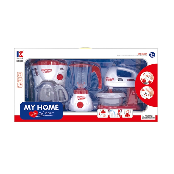 Σετ καφετιέρα, μίξερ και μπλέντερ. Λειτουργικοί διακόπτες και φώτα. Το μίξερ και το μπλέντερ διαθέτουν κινούμενους αναδευτήρες. Διαστάσεις προϊόντος: 14 × 10 × 20 εκ. Διαστάσεις συσκευασίας: 53,5 × 15 × 28,5 cm Λειτουργεί με μπαταρίες τύπου: AA (LR06) x 6 που δεν περιλαμβάνονται