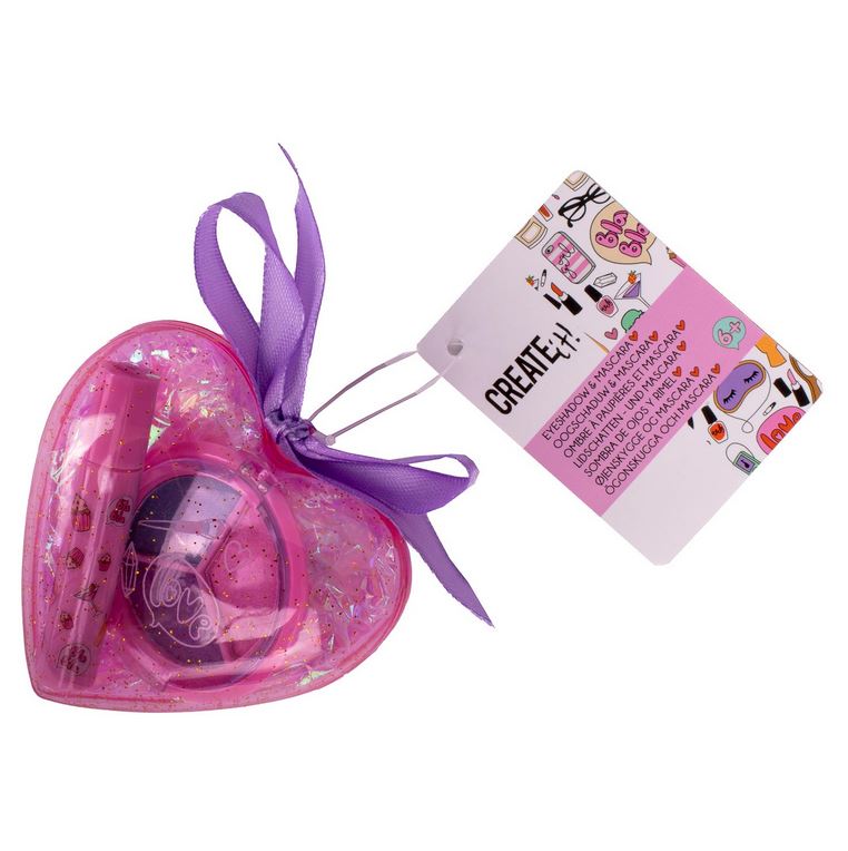 Create It! plastic heart filled with two pieces of toy make-up for children. Available in three sets: 2 nail polishes, eyeshadow and mascara & 2 shades of lip gloss. Suitable for children aged 6 and up.