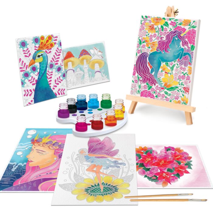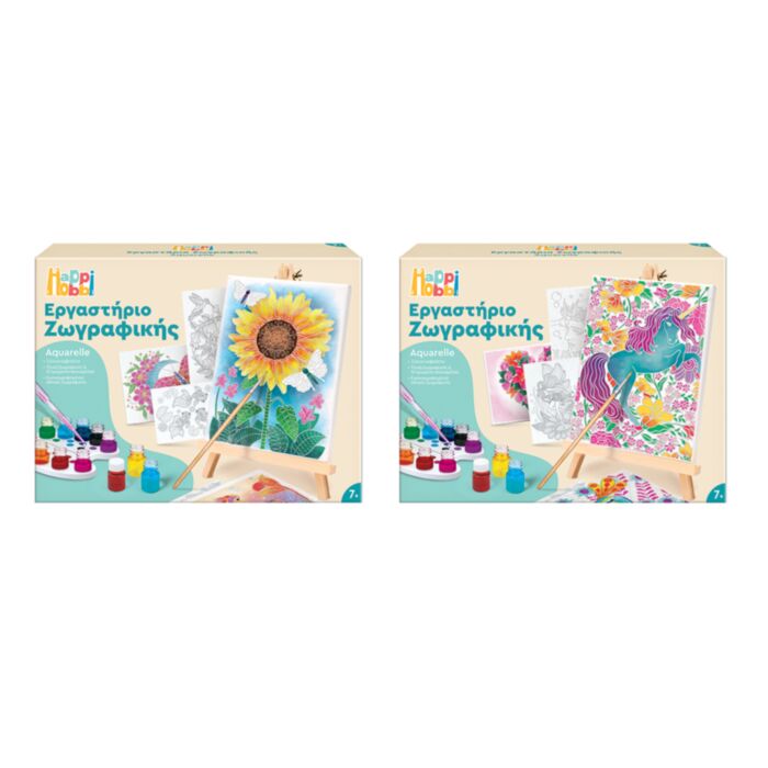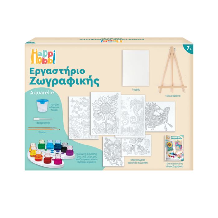 Το HappiHobbi Εργαστήριο Ζωγραφικής Aκουαρέλα είναι το ιδανικό σετ για να μάθει το παιδί να ζωγραφίζει με την τεχνική της ακουαρέλας. Στήστε το καβαλέτο σας και τοποθετήστε μια από τις έξι προ-τυπωμένες καρτολίνες με τα περιγράμματα κεριού. Η τεχνική αυτή θα σας βοηθήσει να χρωματίζετε άφοβα και ελεύθερα σε προ-τυπωμένα σχέδια, πετυχαίνοντας ένα εντυπωσιακό αποτέλεσμα. Όταν νιώσετε πιο άνετοι, αρχίστε να ζωγραφίζετε στον καμβά σχέδια της φαντασίας σας, κάνοντας διάφορες μίξεις χρωμάτων. Ο αναλυτικός εικονογραφημένος οδηγός θα σας βοηθήσει να εξοικειωθείτε με την τεχνική της ακουαρέλας και να αναμιγνύετε τα χρώματα δημιουργώντας νέα.