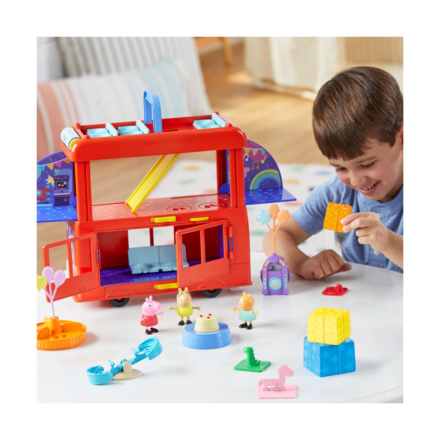 Ετοιμαστείτε για πάρτι περιπέτειες με το 2-σε-1 Party Bus της Peppa! Φανταστείτε την Peppa και τους φίλους να πηγαίνουν μια βόλτα στην ταράτσα με το χαρούμενο κόκκινο διώροφο λεωφορείο και μετά να μεταφέρετε το λεωφορείο σε λειτουργία πάρτι playset για να ανακαλύψετε 3 ορόφους γεμάτη δυνατότητες διασκέδασης. Τι θα κάνουν στη συνέχεια οι φιγούρες Peppa Pig, Danny Dog και Candy Cat; Τι θα λέγατε για ένα χορευτικό πάρτι που χρησιμοποιεί τις πλατφόρμες που στροβιλίζονται; Μια περιστροφή στο παιχνίδι του κυκλικού κόμβου; Μια βόλτα στην τσουλήθρα; Τα μπαλόνια πρέπει να πάνε στο λεωφορείο ή πάνω από το τζουκ μποξ; Εναπόκειται στα παιδιά να δημιουργήσουν το σκηνικό του πάρτι με 3 ειδώλια Peppa Pig και 13 αξεσουάρ με θέμα το πάρτι. Τα παιχνίδια Peppa Pig για κορίτσια και αγόρια 3 ετών και άνω αποτελούν ένα υπέροχο δώρο για τα παιδιά που λατρεύουν την παράσταση!